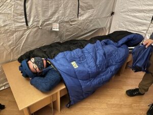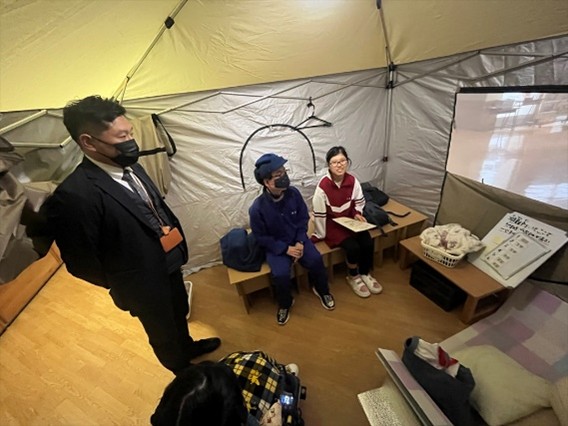 障害のある人の避難所での生活の困難さについて、ニュース等で知った生徒たちが、避難用テントを教室に見立てて1日過ごす体験をすることで、実際に避難所で過ごす場合の困難さの軽減につながる活動である。ねらいは、「仮想避難所で1日生活することで、生活する際の課題を見つける。」ことを設定した。実践を通して、「組み立てた段ボールベッドに寝転がると硬かったから、布団があるといい」、「テントの中にいても、廊下を通る人の声がよく聞こえた」、「テントの中で授業をすることは面白かったけど、狭かった」と生徒から発言を得られた。 (石川県立いしかわ特別支援学校)